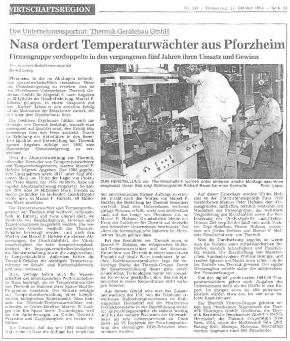 Über die Absatzentwicklung von Thermik, führender Hersteller von Temperaturwächtern und Temperaturbegrenzern, machte Marcel P. Hofsäss folgende Angaben: Das 1968 gegründete Unternehmen setzte 1977 unter fünf Millionen Mark um. Unter der Regie von Prokurist Franz Mayer, der 1991 verstarb, habe ein rapider Absatzaufschwung eingesetzt. So hätten 1991 über 34 Millionen Mark Umsatz zu Buche gestanden. Im laufenden Geschäftsjahr werde man, so Marcel P. Hofsäss, 40 Millionen Mark umsetzen.