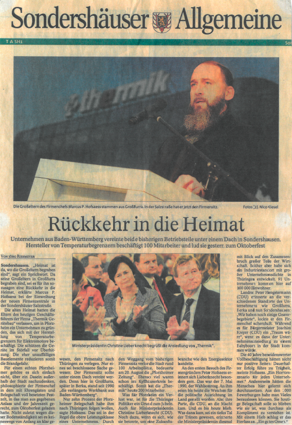 „Heimat ist da, wo die Großeltern begraben sind“, sagt ein Sprichwort. Da seine Großeltern in Großfurra begraben sind, sei es für Hr. Hofsaess eine Rückkehr in die Heimat, erklärte der Unternehmer bei der Einweihung der neuen Firmenzentrale in der Sondershäuser Salztstraße.