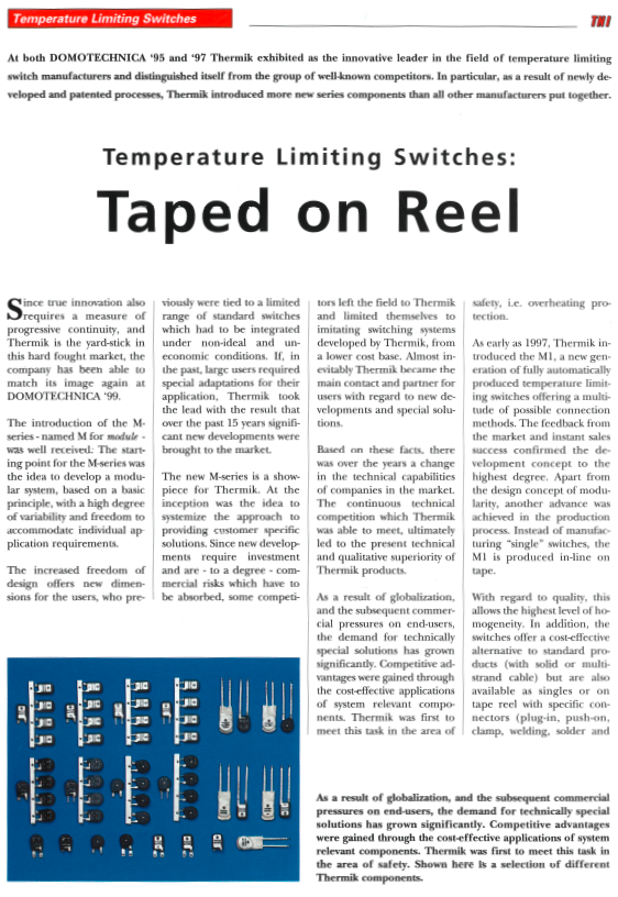 At both DOMOTECHNICA '95 and '97 Thermik exhibited as the innovative leader in the field of temperature limiting switch manufacturers and distinguished itself from the group of well-known competitors. In particular, as a result of newly developed and patented processes, Thermik introduced more new series components than all other manufacturers put together.