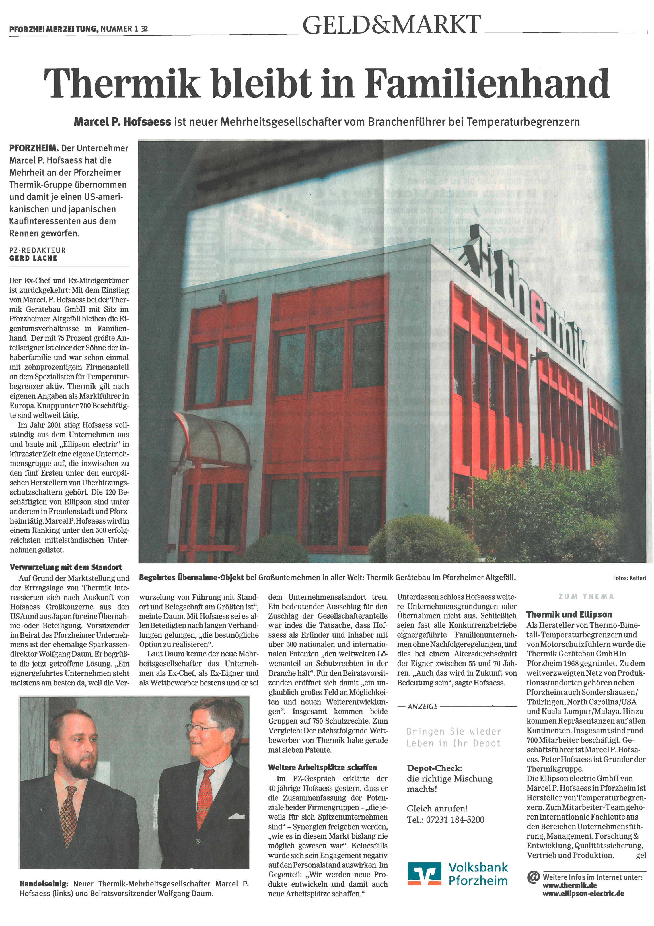 Der Ex-Chef und Ex-Miteigentümer ist zurückgekehrt: Mit dem Einstieg von Marcel P. Hofsaess bei der Thermik Gerätebau GmbH mit Sitz im Pforzheimer Altgefäll bleiben die Eigentumsverhältnisse in Familienhand. Der mit 75 Prozent größte Anteilseigner ist einer der Söhne der Inhaberfamilie und war schon einmal mit zehnprozentigem Firmenanteil an dem Spezialisten für Temperaturbegrenzer aktiv. Thermik gilt nach eigenen Angaben als Marktführer in Europa. Knapp unter 700 Beschäftigte sind weltweit tätig.