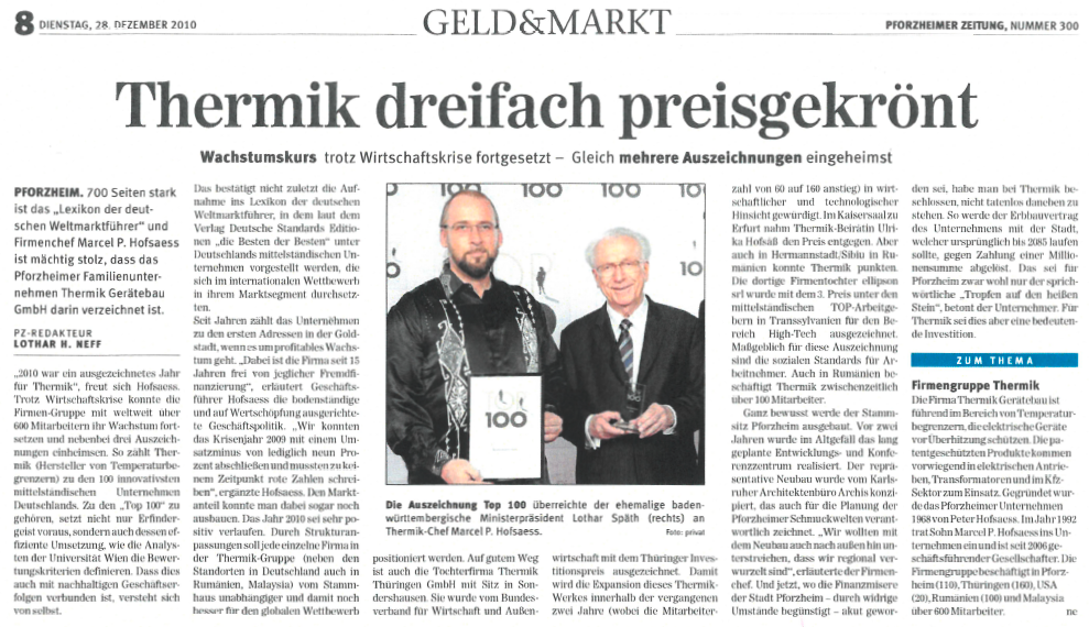 „2010 war ein ausgezeichnetes Jahr für Thermik“, freut sich Hofsaess. Trotz Wirtschaftskrise konnte die Firmen-Gruppe mit weltweit über 600 Mitarbeitern ihr Wachstum fortsetzen und nebenbei drei Auszeichnungen einheimsen. So zählt Thermik (Hersteller von Temperaturbegrenzern) zu den 100 innovativsten mittelständischen Unternehmen Deutschlands. Zu den „Top 100“ zu gehören, setzt nicht nur Erfindergeist voraus, sondern auch dessen effiziente Umsetzung, wie die Analysten der Universität Wien die Bewertungskriterien definieren. Dass dies auch mit nachhaltigen Geschäftserfolgen verbunden ist, versteht sich von selbst. Das bestätigt nicht zuletzt die Aufnahme ins Lexikon der deutschen Weltmarktführer, in dem laut dem Verlag Deutsche Standards Editionen „die Beste der Besten“ unter Deutschlands mittelständischen Unternehmen vorgestellt werden, die sich im internationalen Wettbewerb in ihrem Marktsegment durchsetzten.