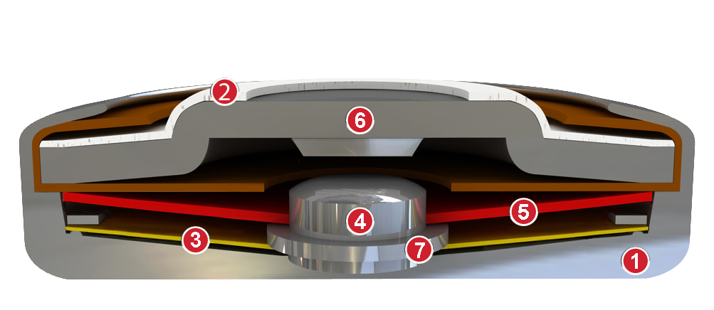 Le mécanisme de commutation de la gamme 02 est encastré par une forme adaptée et auto-alignement entre le fond d’un boîtier conducteur (1) et un couvercle de contact isolé en acier (2) avec contact argent intégré (6) qui ferme celui-ci en forme de pile ronde. Un disque bilame (5) enfonce le contact mobile traversant au centre (4) sur un épaulement circulaire (6) contre le disque ressort (3) contenant également le contact (4) au moyen d’une force de réglage. En raison de la force de réglage élevée du disque bilame (5), le contact de commutation reste ouvert contre la résistance mécanique du disque ressort (3) avant d’atteindre la température de commutation nominale. Le contact reste ouvert tant que le disque bilame – en réagissant uniquement à la température ambiante – fonctionne en continu et que sa forme change. Ce n’est que lorsque la température de commutation nominale est atteinte que le disque bilame (5) s’enclenche dans sa position inversée et le contact se ferme par la pression du disque ressort (3) qui se dégage brusquement. Le disque ressort (3) est maintenant l’élément de transfert du courant et permet ainsi un fonctionnement continu du disque bilame (5). Lorsque la température de réenclenchement est atteinte, le disque bilame se réenclenche dans sa position initiale et le contact est de nouveau ouvert.